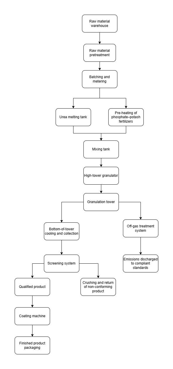 Гранулирование - это передовой производственный процесс, который использует гравитацию и теплообмен для получения сложных удобрений. Расплавленная смесь NPK-сырья распыляется с вершины высокой колонны (обычно 80-110 метров) и охлаждается при свободном падении, превращаясь в полые сферические гранулы. Это непрерывный процесс без использования воды, который создает высокорастворимое удобрение с превосходным усвоением питательных веществ.